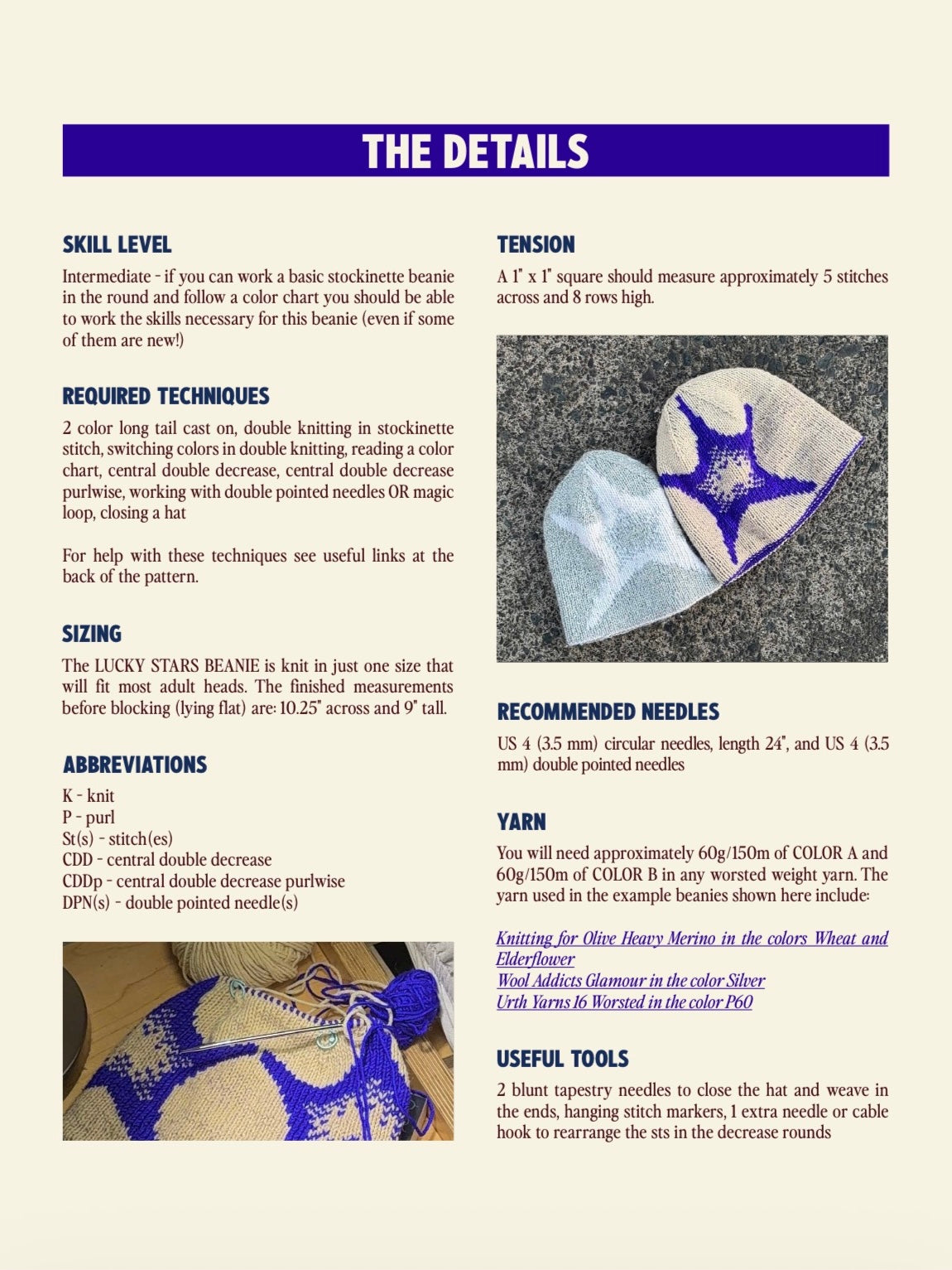 The LUCKY STARS Beanie is a double-knit colorwork beanie featuring two stars in a high contrast graphic design. It’s worked seamlessly from the bottom up in the round and creates a fully reversible design, with the image appearing on both sides.